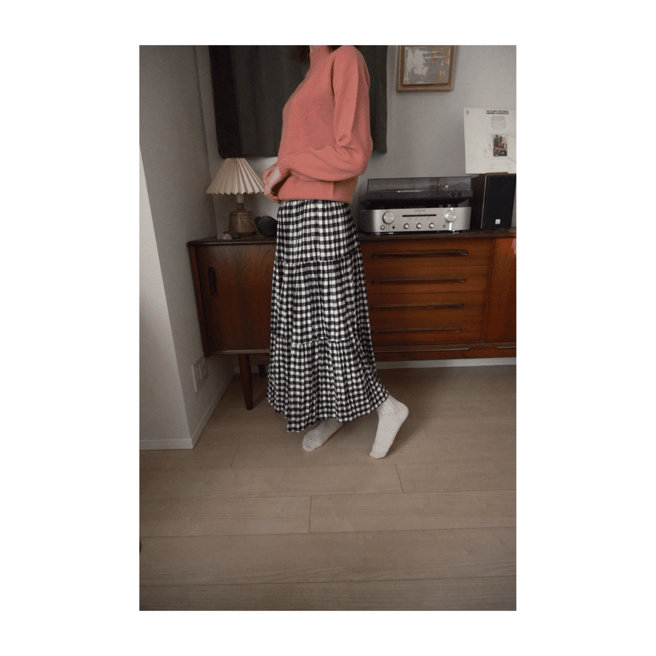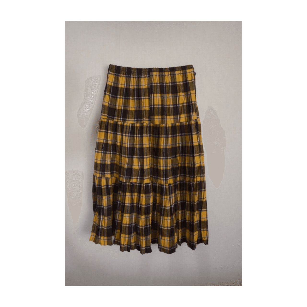 オリーブ×ブラックのチェックが程よい落ち着きを添え、三段切り替えのギャザーが歩くたびに柔らかく揺れます。