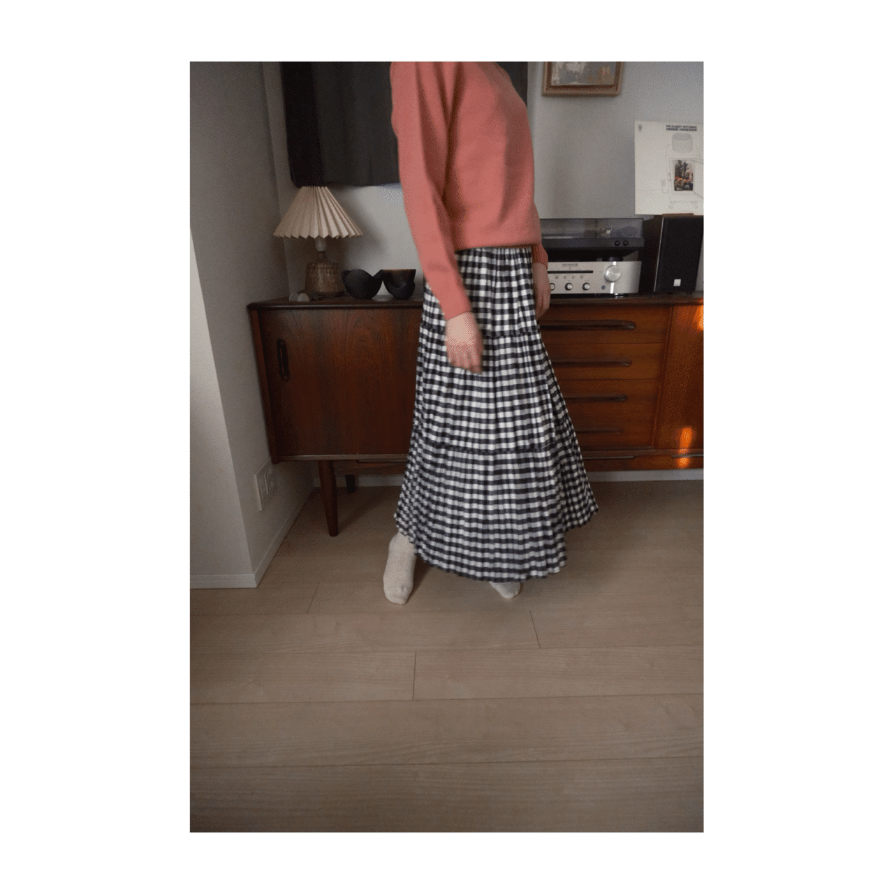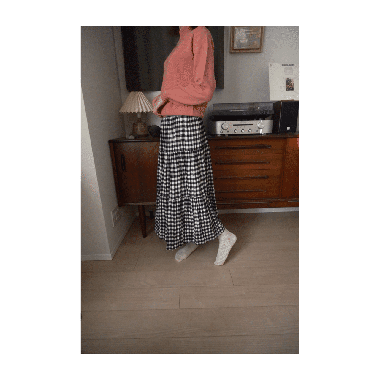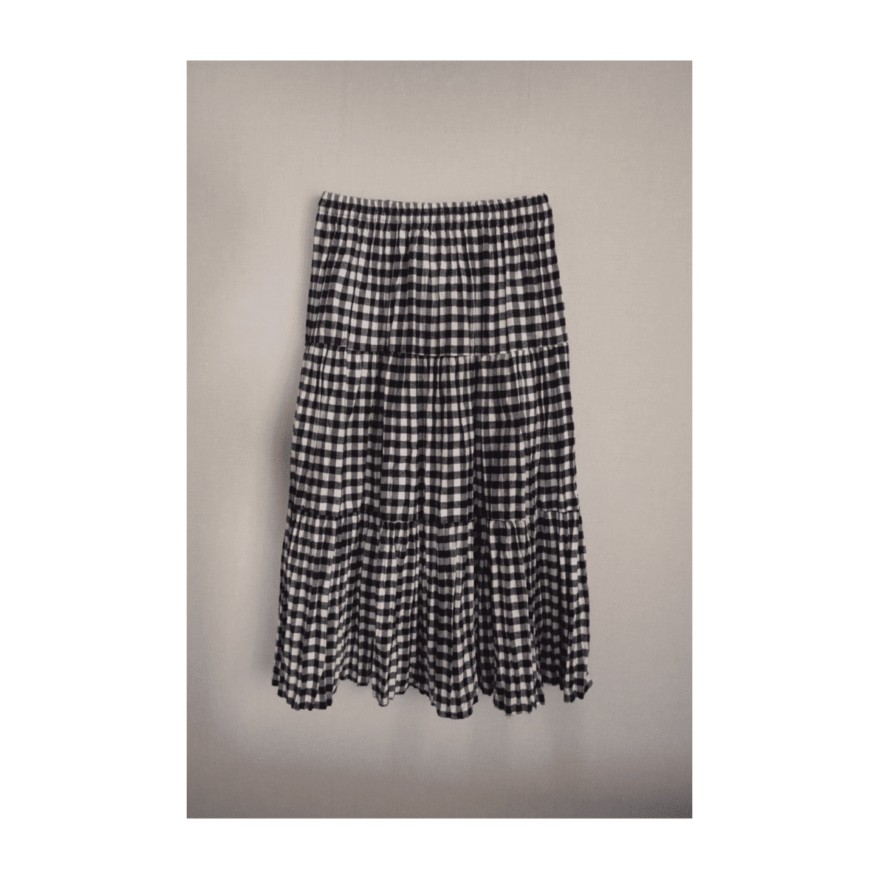 白黒チェックと三段ギャザーがやわらかく揺れる、コットン100%のティアードスカート。