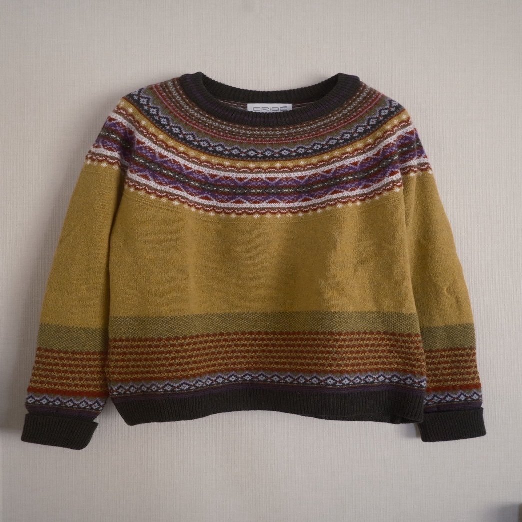 マスタードイエローをベースに、多色使いのフェアアイル調ヨーク柄が襟元から胸元へ連なるERIBÉのアルパインセーター「findborn」。