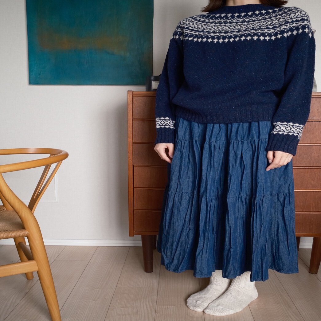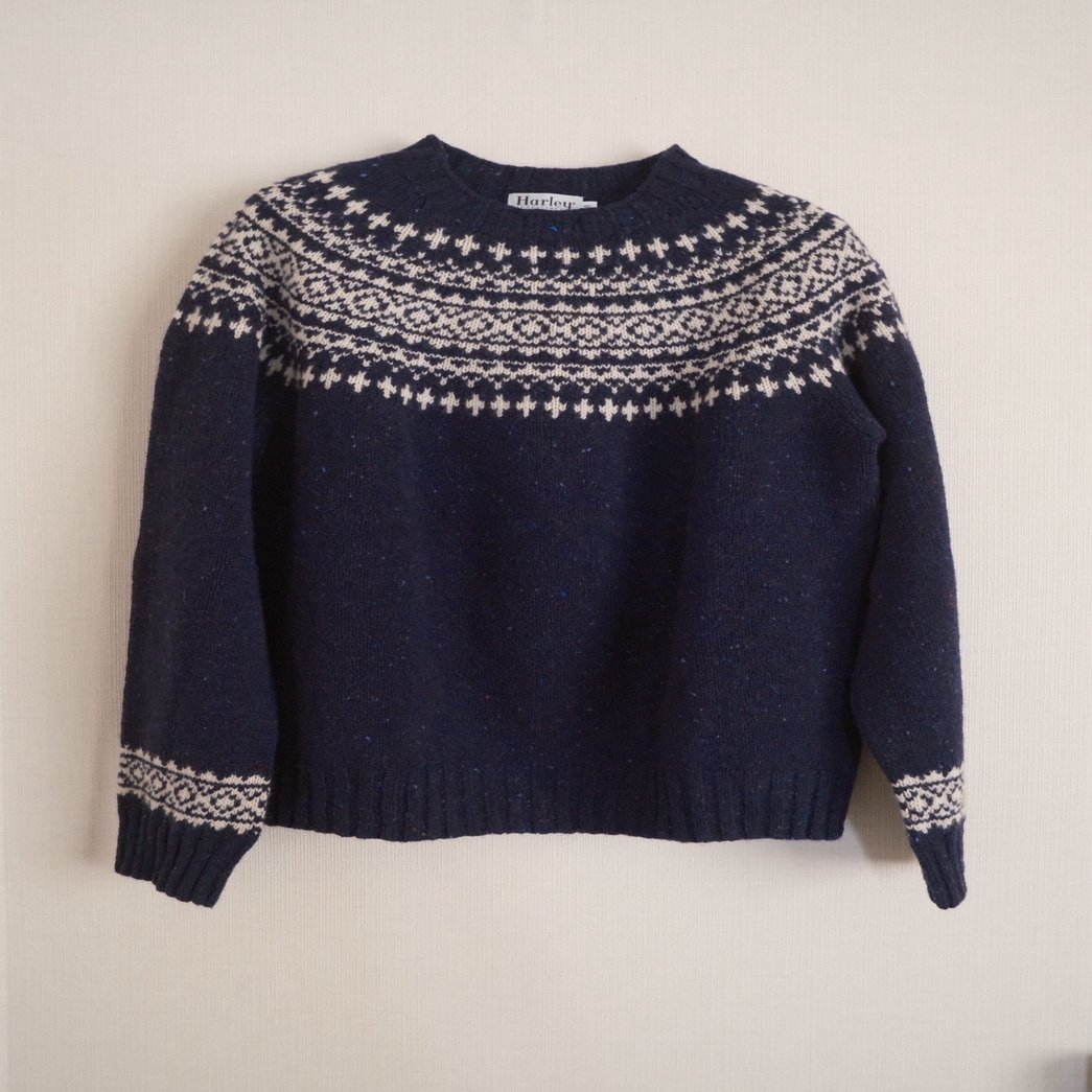 ネイビー地にバニラ色のヨーク柄をあしらった、クラシックなフェアアイル調のセーター。