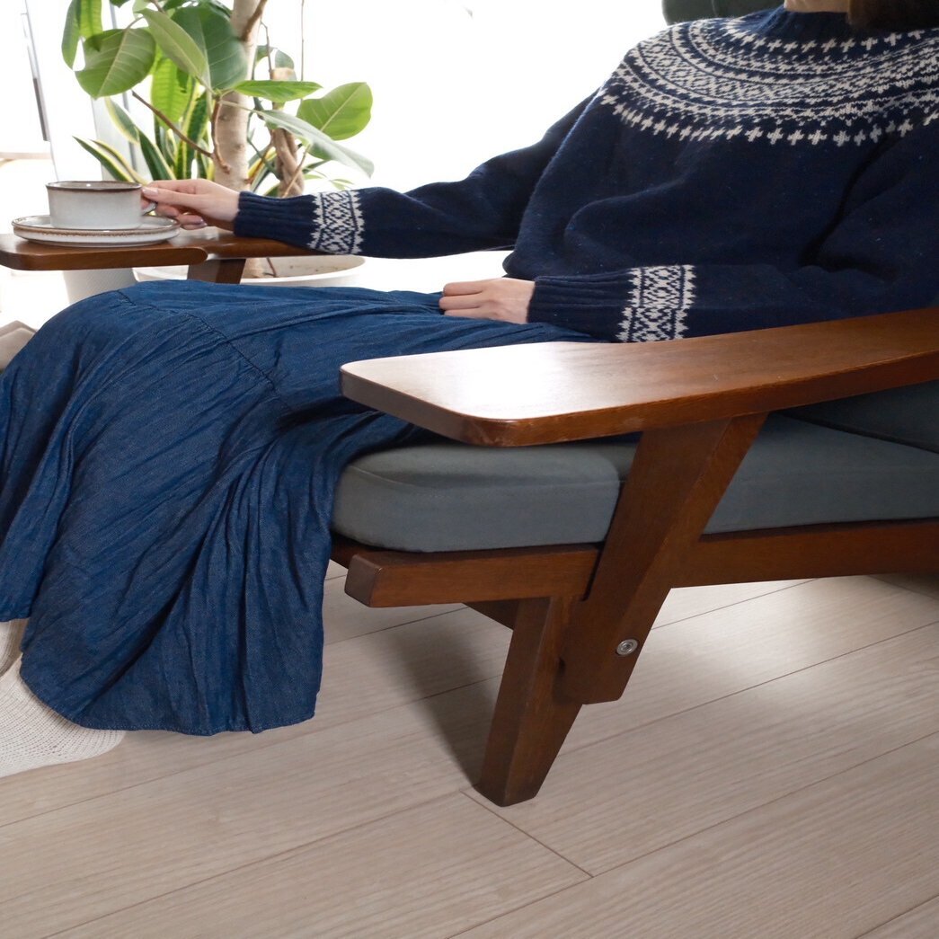 無地の濃紺デニムは季節を問わず活躍し、ほどよいシワ感がナチュラルなニュアンスをプラス。