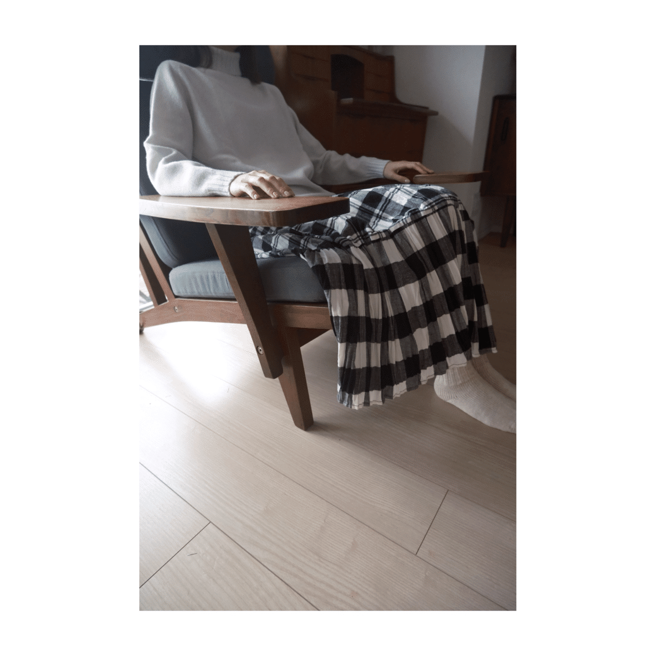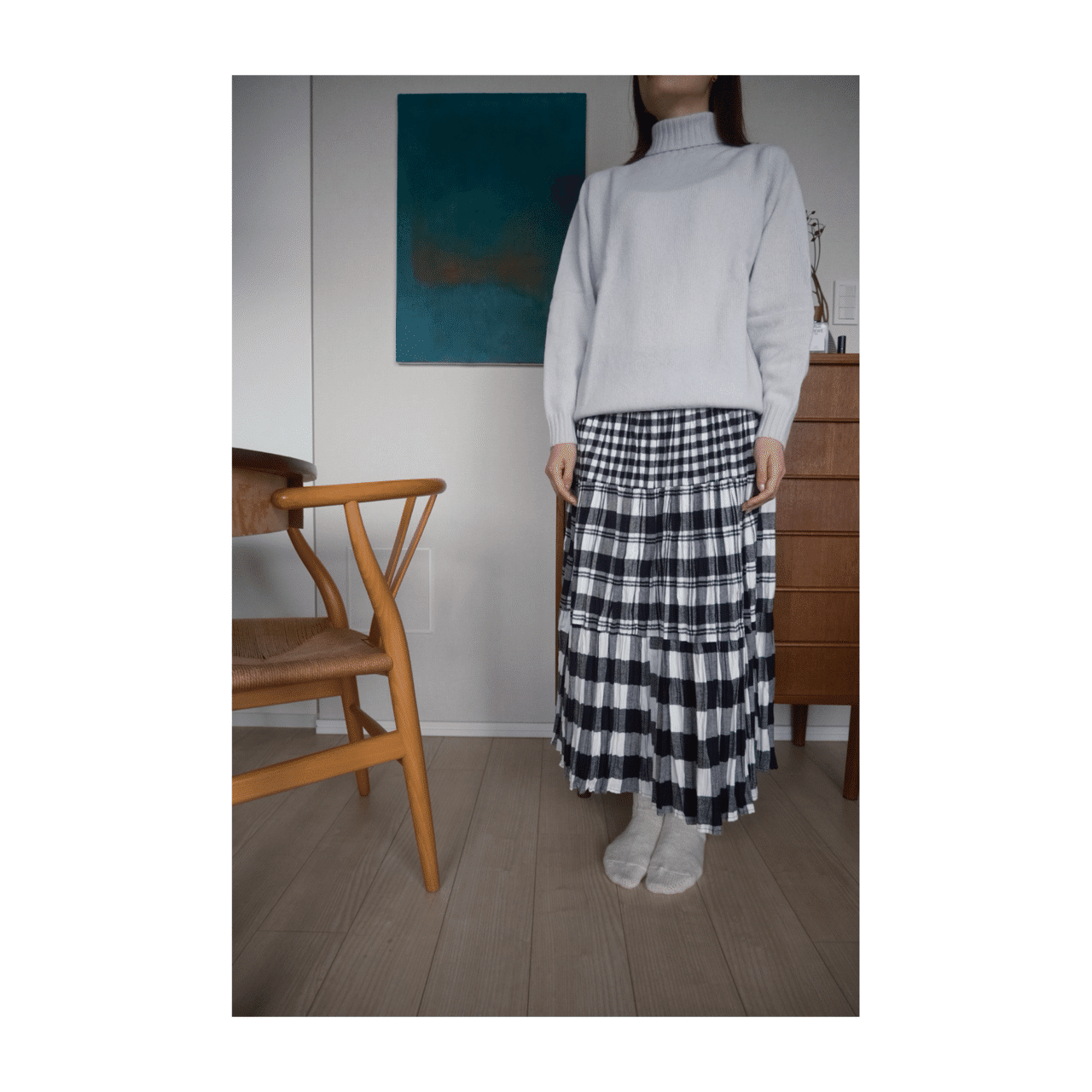 淡グレーのタートルで顔映りを明るく、白黒チェックで下半身にリズムを加えます。